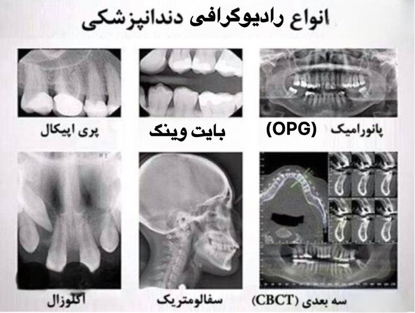 - رادیوگرافی (CBCT): تصاویر سه بعدی، با دقت بالا از دندان ها برای ایمپلنت، جراحی و بررسی دقیق ریشه که نسبت به سایر عکس ها گران تر است.